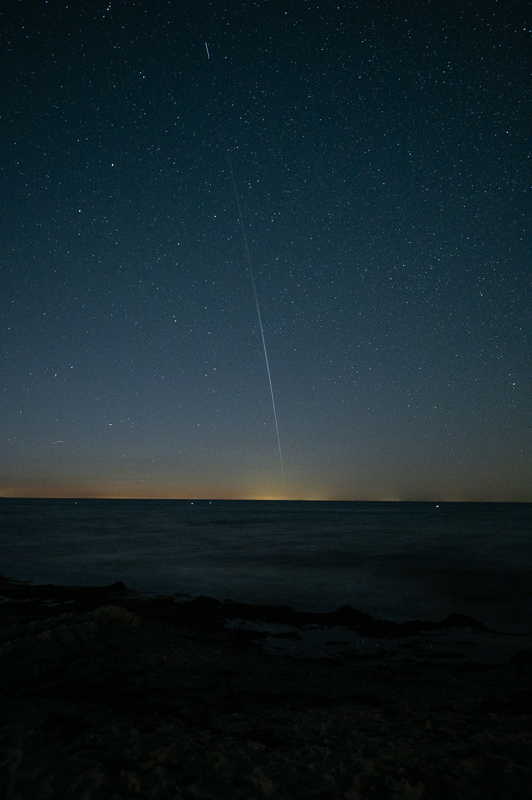 Ab Bild 3, links an dem hellen Strahl ist vermutlich der Satellit. Er bewegt sich von unten an der Linie nach oben, bis ich ihn nicht mehr auf den Fotos habe.