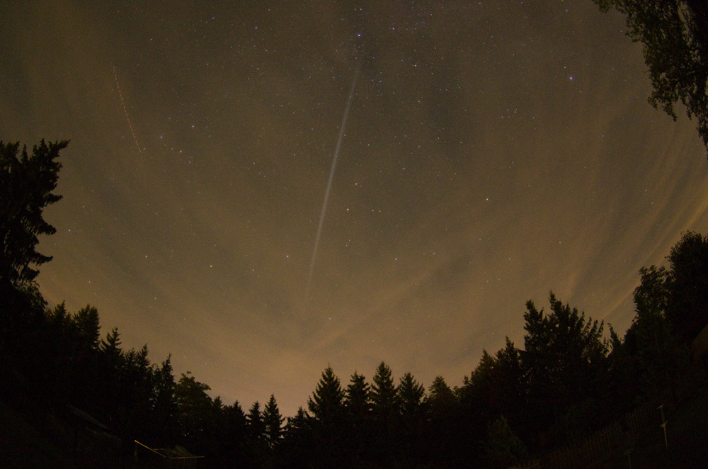 22:40 MESZ: 22:44 MESZ: Das sah schon "komisch" aus - definitiv kein Kondensstreifen (zu hell und nach Anschauen der ersten Testbilder auch zu "weiß" - die Cirren sehen ja dank Lichtverschmutzung gelb aus). Wollte hier um Aufklärung bitten, fand aber vorher schon diesen Artikel: