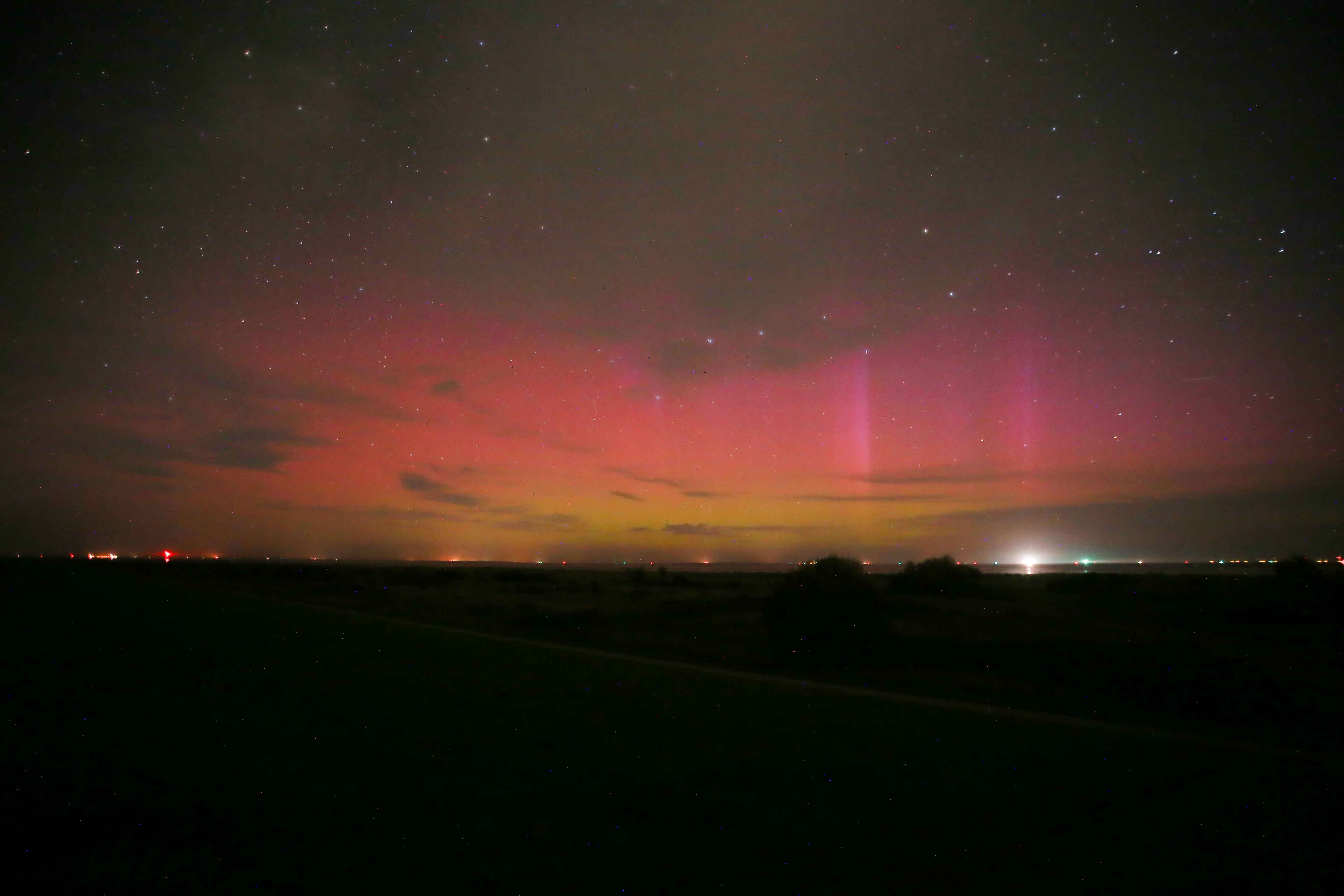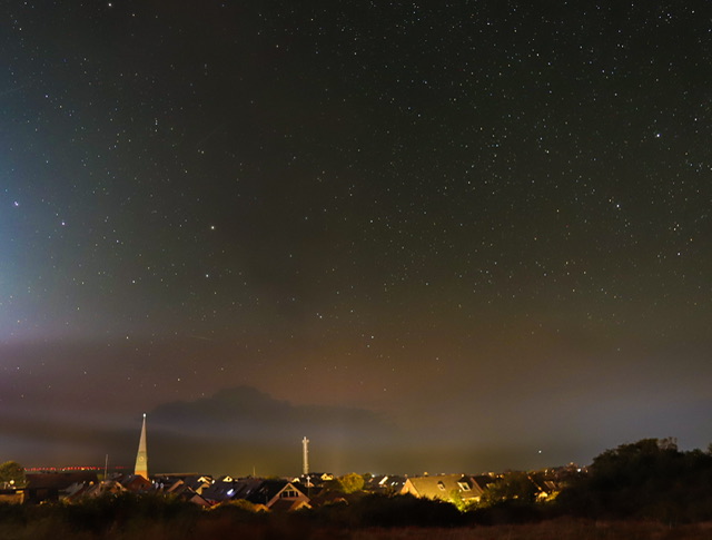 Lange Zeit war hinter den Wolken über der Nordsee ein gewisses "Leuchten" zu sehen, sodass man hier wohl von "schwach visuellem Polarlicht" sprechen konnte, allerdings waren Beamer so gut wie garnicht visuell zu erkennen. (Das mag aber auch daran gelegen haben dass da wie gesagt doch einige Wolken am Himmel waren, die immer Einiges verdeckten, und allgemein diesig/nebelig schien es zeitweise auch zu sein.)