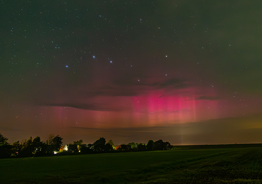 Danach war vorerst nichts und gegen 23 UTC wechselte ich den Standort auf einen Feldweg, da auf dem Deich das Objektiv immer wieder beschlug. Auf dem Feldweg dann auf dem ersten Foto deutliche Strahlen, welche plötzlich sogar schwach und dann deutlich visuell wurden. Man konnte eventuell auch die rote Farbe erahnen. Das Polarlicht schwächte sich dann wieder ab, blieb aber bis Beobachtungsende zumindest fotografisch sichtbar, zunehmend auch mit grünem Anteil: Interessant in der Nacht war das schon angesprochene teils intensive grüne Airglow.