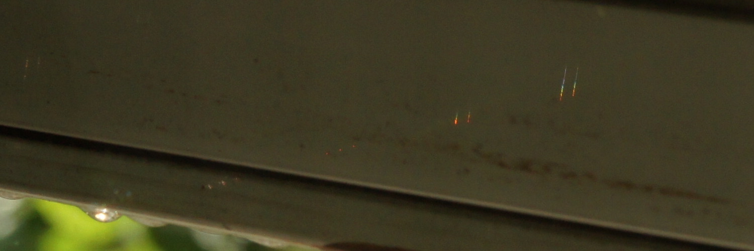 Sonntag Morgen habe ich gelegentlich die Möglichkeit, etwas länger zu schlafen. Heute war so ein Sonntag. In der Nacht hatte es kräftig geregnet, aber morgens weckten mich die Sonnenstrahlen. An dem Rolladen hatten sich einige Regentropfen gebildet, die nicht mehr abgetropft sind – und das Sonnenlicht wie ein Prisma in allen Regenbogenfarben streuten. Das ist wahrlich nichts besonderes, da schon wiederholt beobachtet. Die Faszination aber bleibt, und so holte ich meine Kamera, um die Farben einzufangen. Das enttäuschende dabei: es ist meistens nur eine Farbe an einem Tropfen einzufangen, da jeder Tropfen das Licht in eine etwas andere Richtung streut.