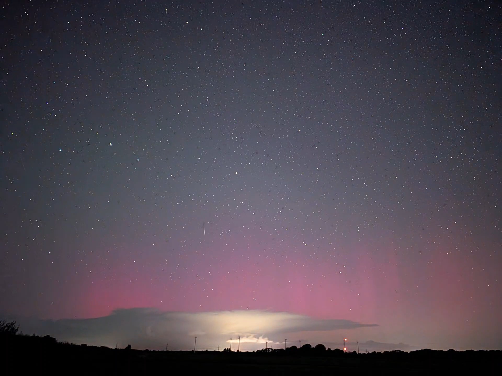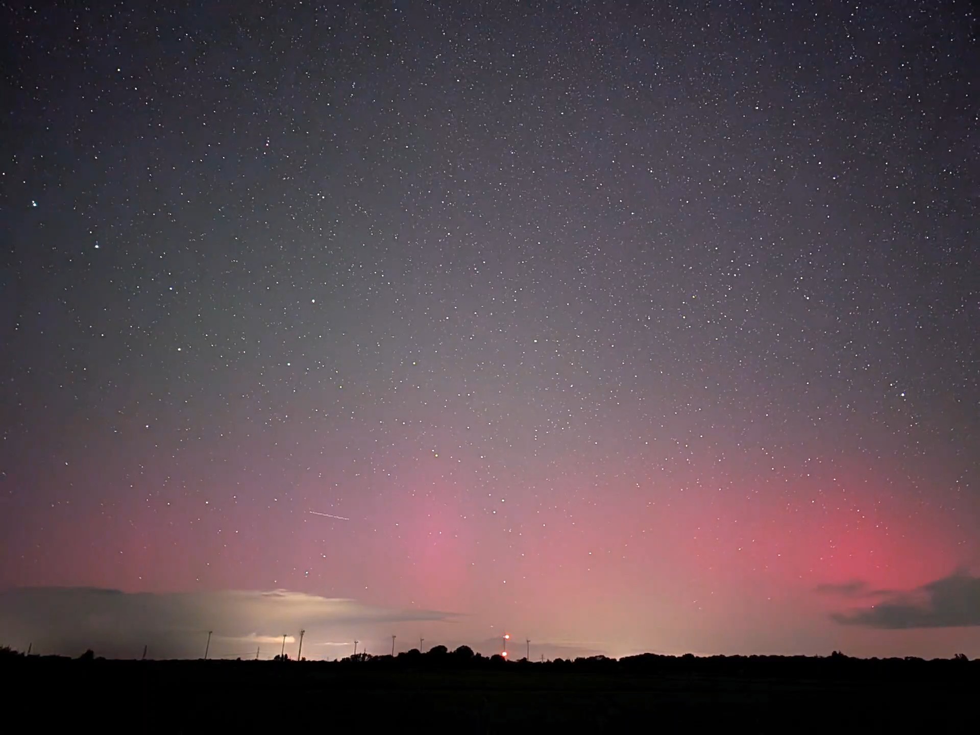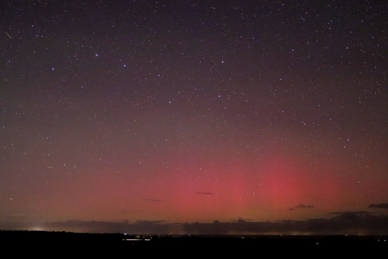 ich wollte Messungen der Himmelshelligkeit mit Fischauge südl. von Dagebüll machen, es war zeitweise stark bewölkt und regnete. In einem grösseren Wolkenloch fiel grünes Airglow und vor allem der rötliche Schimmer im N auf. Am hellsten erschien es mir gegen 22:55 CEST, gegen 23:45 war nichts mehr zu sehen, da hinter Wolken....