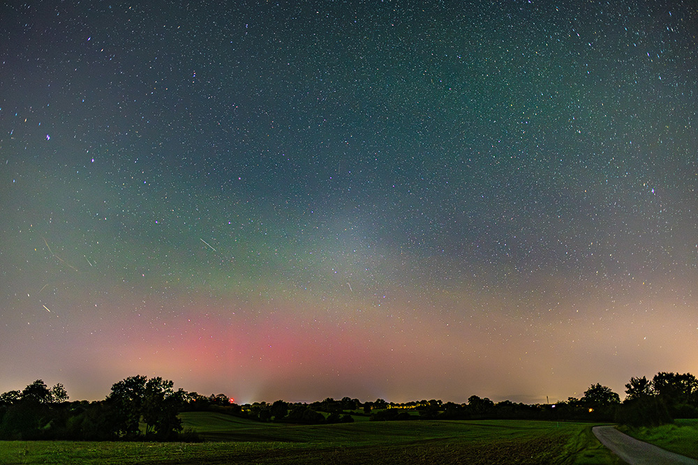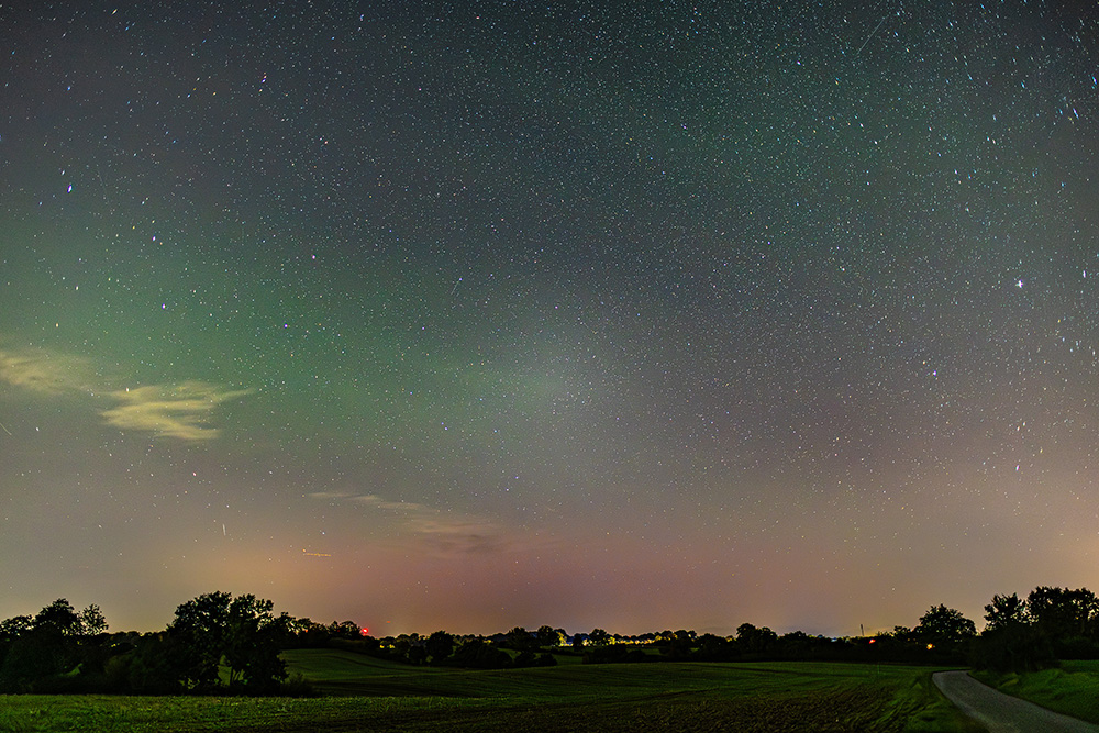 Eigentlich war ich an diesem Abend nur für Milchstraßenfotos draußen, das Wetter war ja perfekt und die Luft sehr klar. Positioniert hatte ich mich auf einem Feldweg bei Rethwisch südöstlich von Bad Oldesloe. Während der Beobachtung fiel mir teils kräftiger grüner Airglow nach Norden auf, sodass ich eine Serienaufnahme startete. Gegen 22:30 MESZ hatte ich plötzlich etwas rötliches Glimmen drauf, was sich später dann auch auf der Webcam in Kap Arkona zeigte. Einmal ein Bild vom rötlichen Glimmen in Horizontnähe: