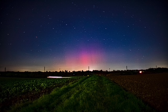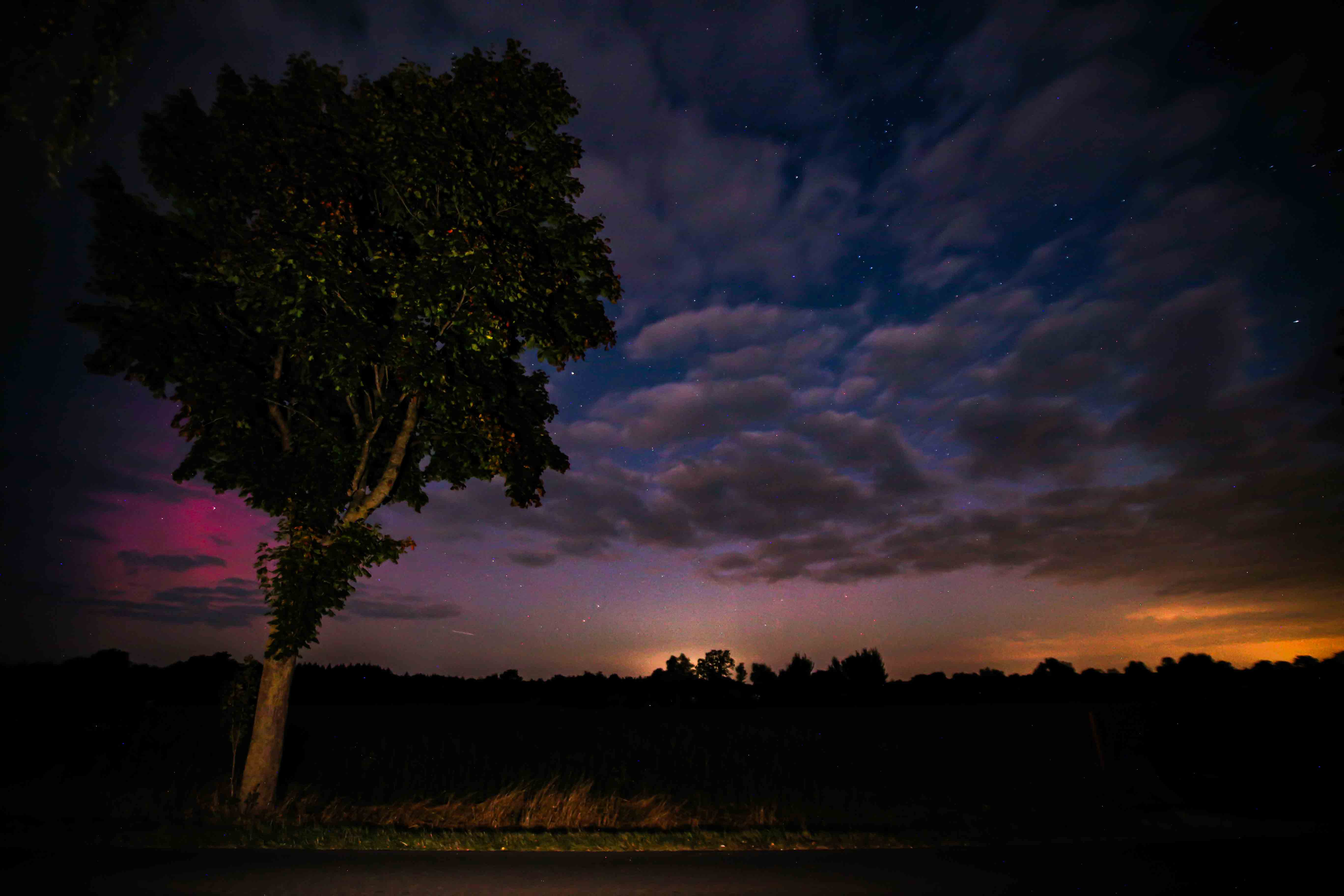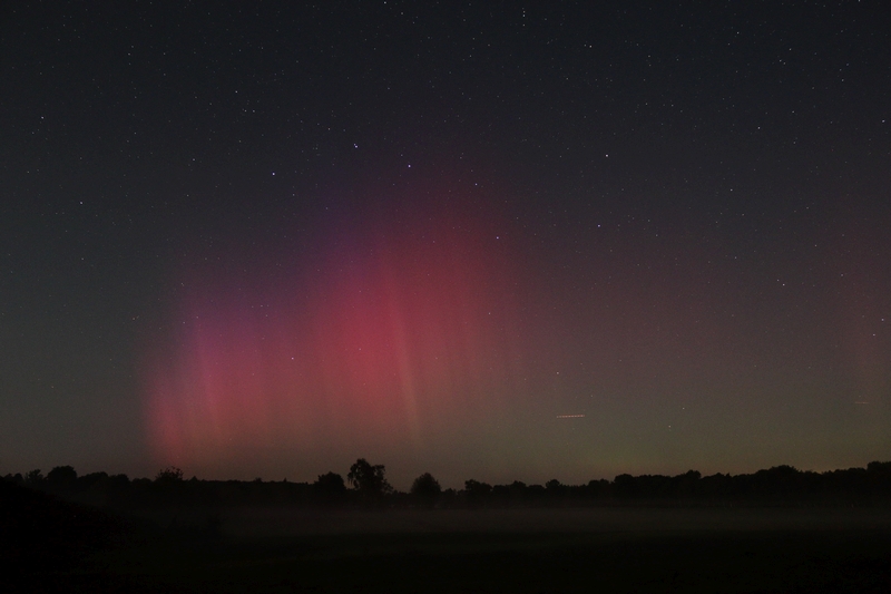 Hallo! Seit einiger Zeit in Curau bei Lübeck schwach visuelles Polarlicht in Wolkenlücken. Fotografisch rot-violette Strahlenbündel.