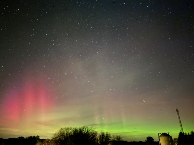 Bei Eilsdorf in Schleswig-Holstein ist aktuell der grüne Bogen deutlich visuell zu erkennen. Ab und zu auch Strahlen. Auch Protonenaurora (grüne Flecken) waren zeitweise visuell sichtbar. Fotografisch ist noch rot und violett über dem Bogen.