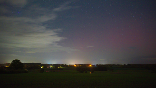 Meine WebCam in Büdelsdorf konnte ebenfalls fotografisches Polarlicht aufnehmen, leider auch viele Wolken dazwischen, aber dennoch nachweisbar: schwaches rotes Glimmen / rote Beamer.