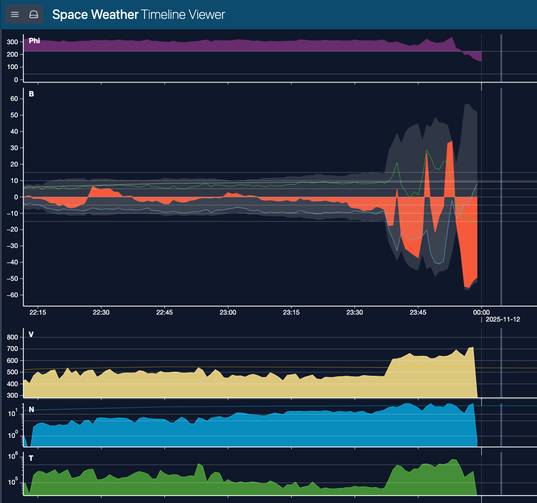 A first solar wind shock arrived around 22:15 UTC on 11 November 2025. The solar wind speed jumped from 400 km/s to 500 km/s, and the total interplanetary magnetic field (IMF) rose from 5 to 12 nT. This disturbance is associated with the coronal mass ejection (SIDC CME 598), following the X1.7 flare (SIDC flare 6002) at 07:35 UTC on 9 November, with an initiation speed of about 720 km/s.