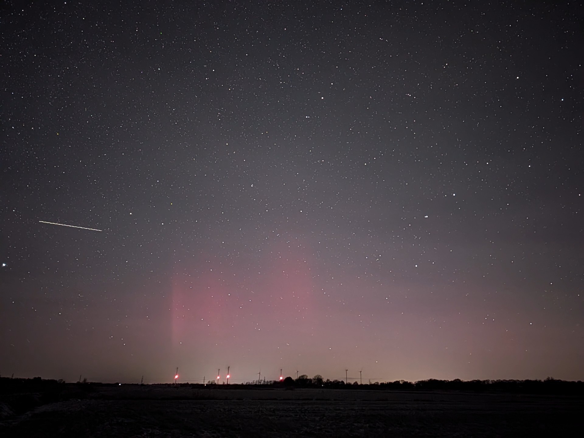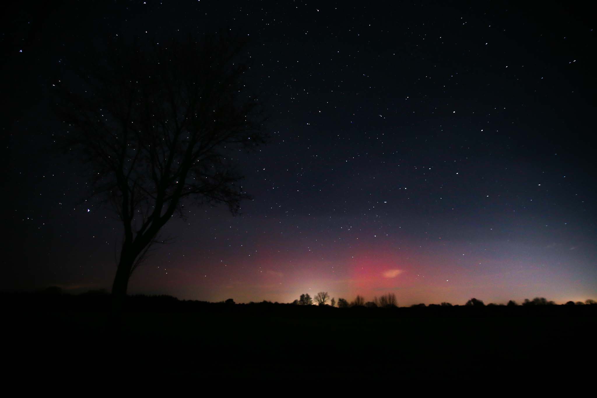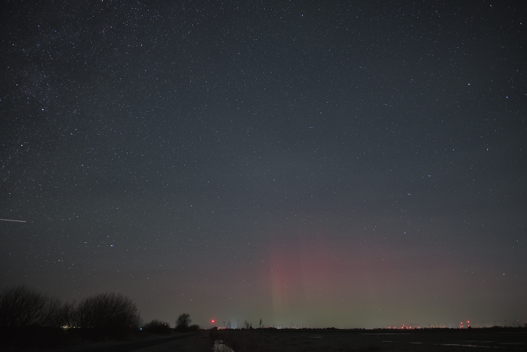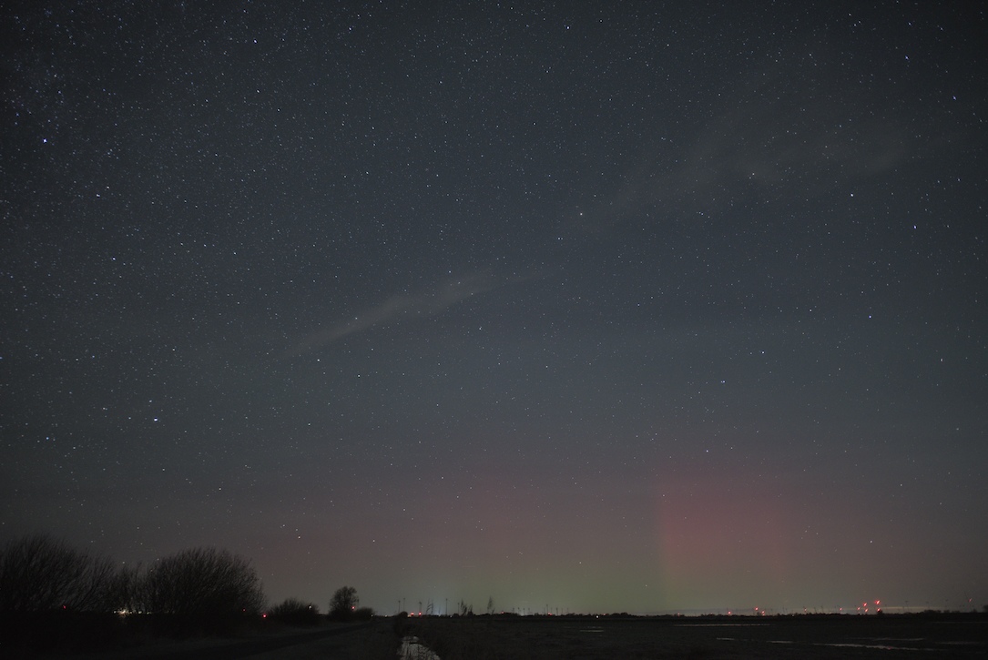 Das Polarlicht war auch schon von Beginn an als rötliches Glimmen vorhanden. Später gesellten sich dann Strahlen dazu. Das Polarlicht konnte ich im Gegensatz zum Airglow nicht visuell erkennen, sodass es "nur" ein fotografischer Nachweis war.