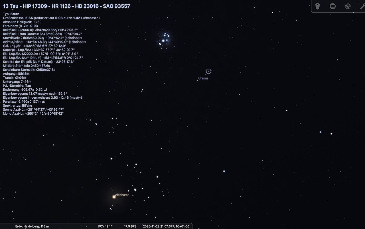 Ganz in der Nähe der Plejaden steht jetzt der Uranus. Er befand sich in der vergangenen Nacht in Opposition zur Sonne und ist lt. stellarium +5.6 mag hell. Er steht nahe des fast gleichhellen Sternes 13 Tau (+5.6 mag). Beide konnte ich gestern Abend mit bloßem Auge auffinden. Also die Gelegenheit, diesen fernen Planeten mal mit unbewaffnetem Auge zu erwischen. Mit 12x60 war praktisch kein Helligkeitsunterschied zwischen Stern und Planeten festzustellen. In den kommenden Jahren wird er noch etwas heller werden (Sonnennähe im Jahr 2050, Oppositionshelligkeit +5.4 mag). Die Kantenstellung erfolgte 2008, und 2029 werden wir auf den Nordpol sehen (seine Rotationsachse ist um 98° gegen die Bahnebene geneigt!). Schon jetzt sind die Ringe nahezu von "oben" zu sehen, und fotografisch lassen sich die Ringe von versierten Amateurastronomen immer besser ablichten.