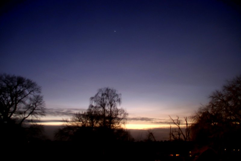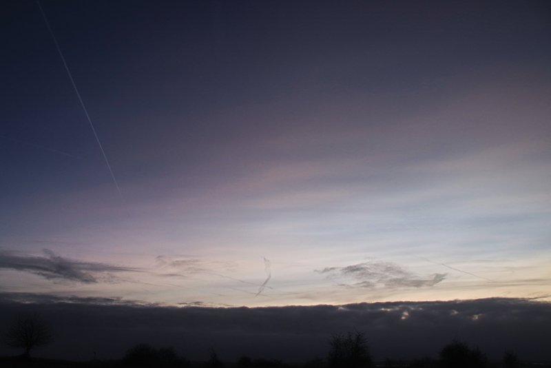 Um 7 Uhr klingelte der Wecker zur Himmelsbeobachtung, schnell ein Kaffee (derweil den letzten Regenschauer abwarten) und raus: In westlicher Richtung ging der Mond unter, in östlicher Himmelsrichtung grüßte die Morgendämmerung. Um 07:30 Uhr (Ortszeit) noch ohne Anzeichen von PSCs.