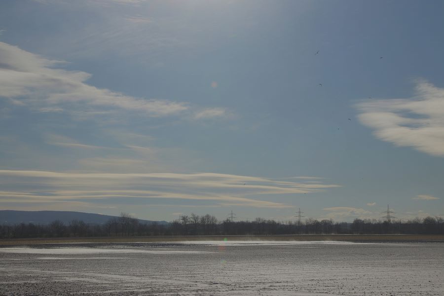 Heute Vormittag als auch Nachmittag zeigten sich über dem Wiener Becken in einem heftigen Föhnwind um die 60Km/h aus WNW stark irisierende Ac len und Kondensstreifen, die sich bläulich in Sonnennähe färbten. 6 Grad C, 61% RF. Kondensstreifen lösten sich schnell wieder auf.