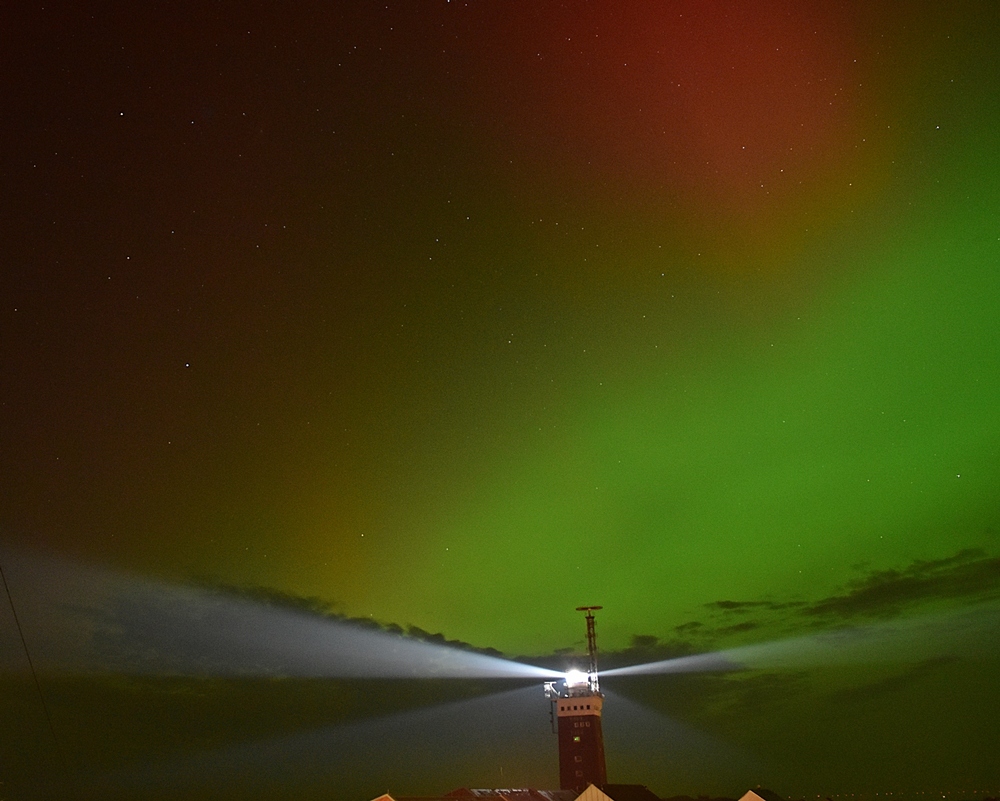 Neben dem Leuchtturm bildete sich ein roter Bereich, der aussah wie ein Nordlicht-Tornado.