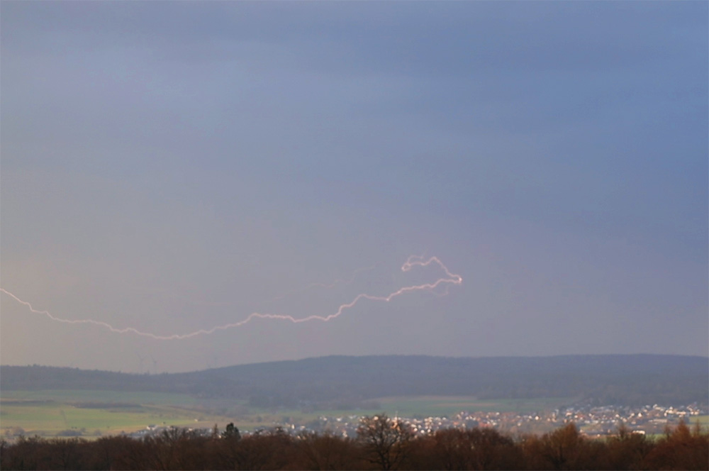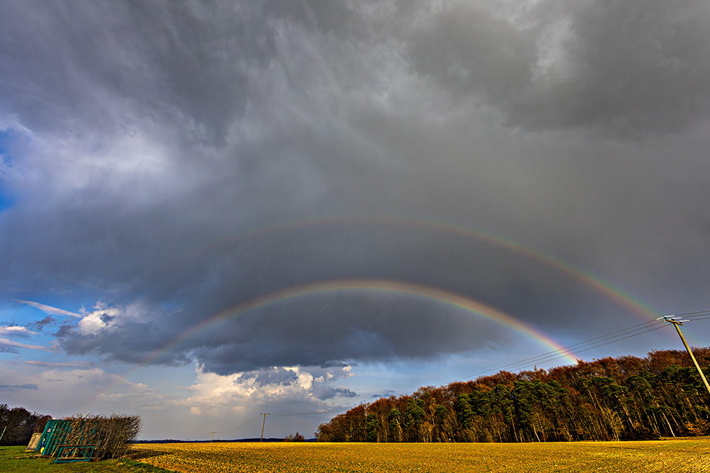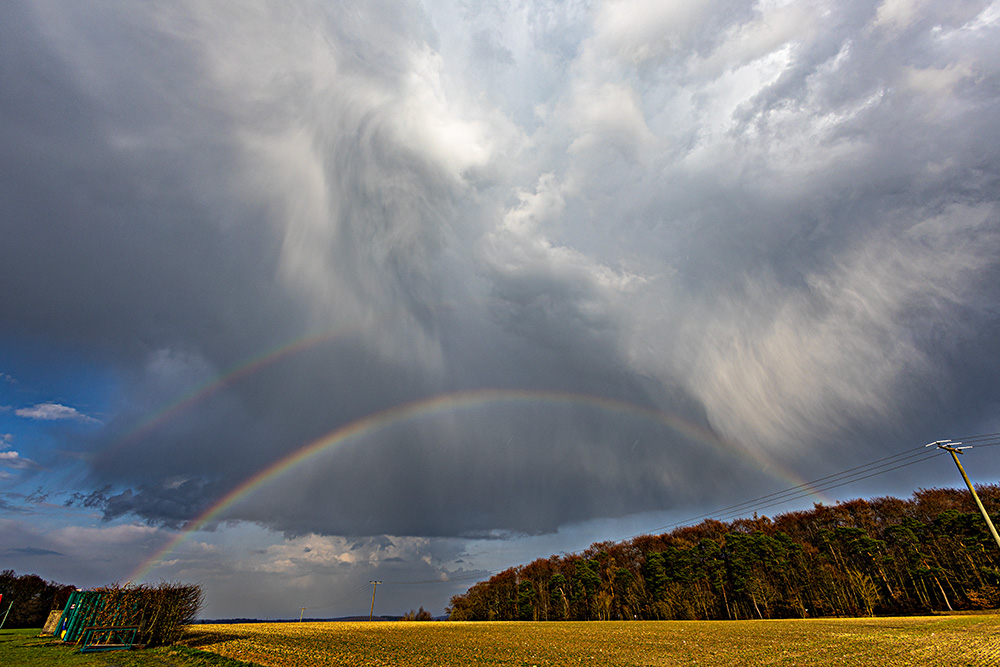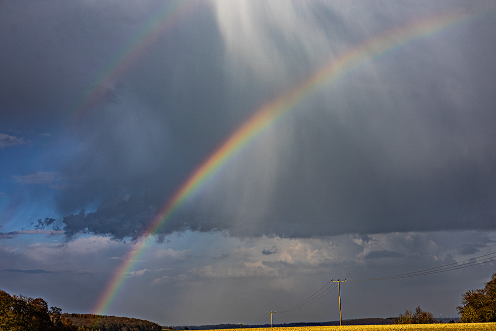 Später gab es dann einen doppelten Regenbogen, vermutlich dazu gespalten: Mit tollen Fallstreifen (Virgae): Und das linke Fragment, mit 50 mm Brennweite: Eine Entladung durfte natürlich auch nicht fehlen (aufgenommen mit 100 mm Brennweite):