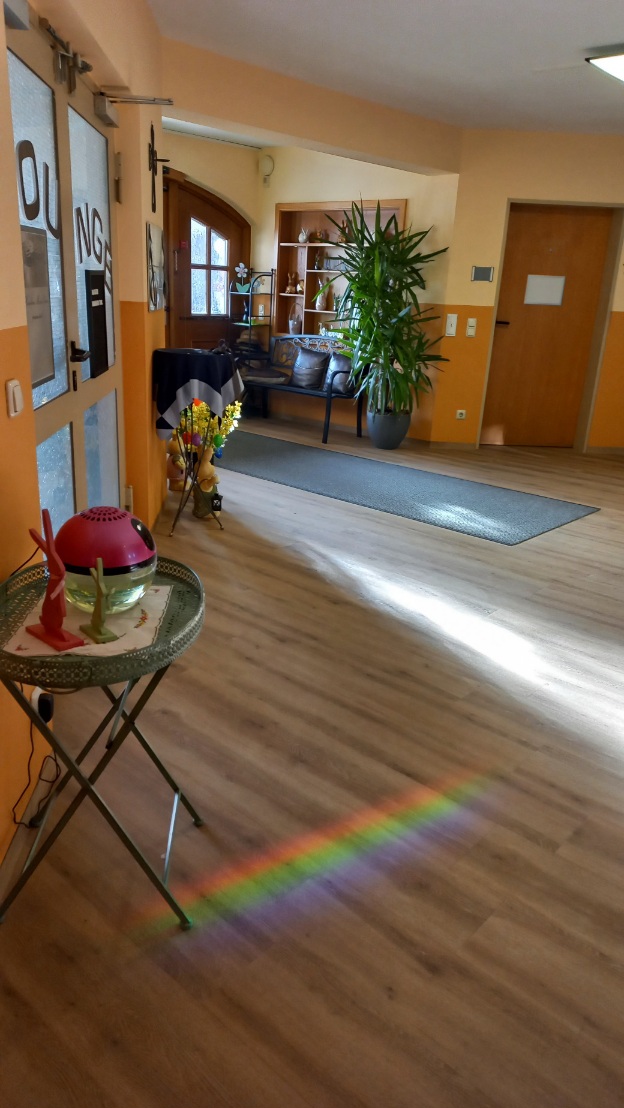 War für eine ganz kurzen Moment diese schöne Lichtbrechung auf dem Fußboden meiner Arbeit zu sehen. Seit 10 Jahren noch nicht so dort gesehen. Vermutlich durch die Scheibe der Tür, Art Milchglas.