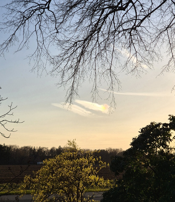 Am 19.03.2025 saß ich gemütlich auf meiner Terrasse in Scheeßel-Jeersdorf beim Telefonieren, als mir plötzlich der bunte Fleck am Himmel auffiel: das erste Mal, dass ich eine Nebensonne gesehen habe! Schnell zwei Fotos mit meinem Smartphone (Samsung S24) gemacht und zur Straße gelaufen, um die Sonne dazu mit aufs Bild zu kriegen - das hat geklappt