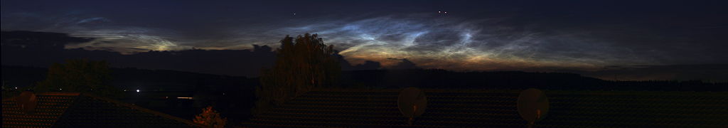 Bei der Gelegenheit habe ich mir noch ein Bild aus Wancourt in Nord-Frankreich vorgenommen, das das NLC-Feld über Deutschland, den Niederlanden und der Nordsee zeigt. Es handelt sich dabei um das APOD vom 9. Juli: http://apod.nasa.gov/apod/ap160709.html (Bild anklicken für Panorama-Darstellung)