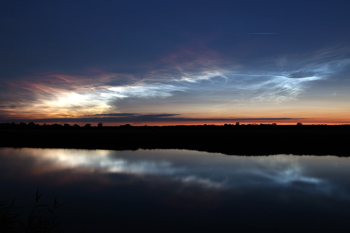 Im Internet konnte ich dann auch schon von großen Displays weiter südlich in Deutschland lesen, was meine Vermutung bestätigte, das es sich hier tatsächlich um NLC handelte. Ich zog mich also unerwartet schnell an und radelte eilig zum Ryck, weil das der nächst gelegene Ort mit freiem Blick nach West, Nord und Ost ist. Auf der kurzen Fahrt konnte ich in Wolkenlücken über mir die NLC gut und eindeutig erkennen, aber als ich dann am Ryck ankam, war von den NLC nichts mehr zu sehen oder zu fotografieren, die letzten Lücken in den Wolken hatten sich komplett geschlossen.