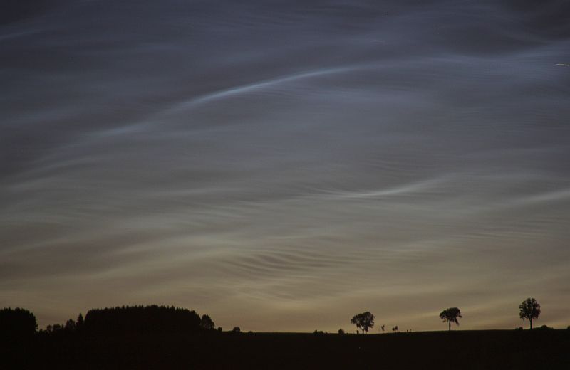 Beobachtung einzelner NLC-Abschnitte bereits ab etwa 21:55 MESZ in der noch hellen Dämmerung, Abbruch der Beobachtung um 23:15 MESZ, NLC war im NNW immer noch zu sehen.