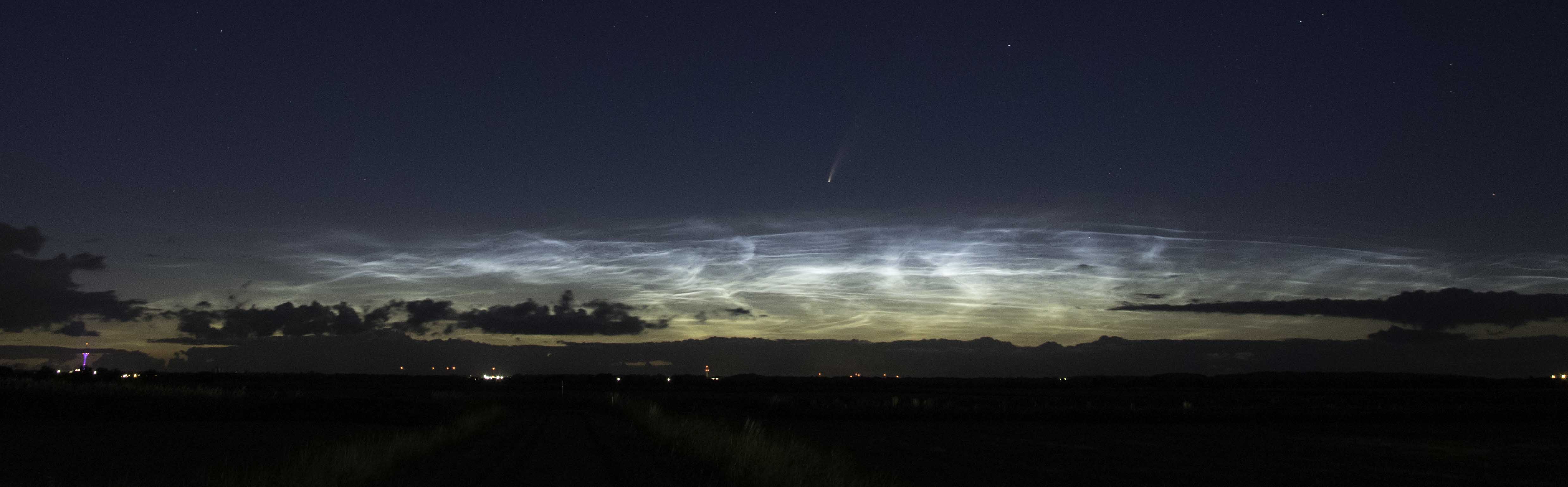 Nach einigen vielen Fotos von Neowise waren aber inzwischen auch die Wolken vor den NLC weggezogen. Sie waren sehr horizontnah, aber verdammt hell (H 4). So bin ich also noch länger geblieben und konnte noch richtig stimmungsvolle NLC mit Kometen beobachten.