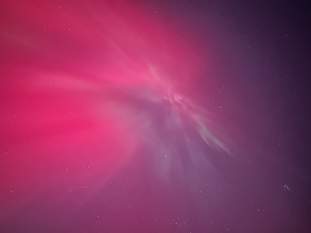 Die Hany-App rumorte und ein Blick aus der Haustür war fällig: ein enorm helles Polarlicht teils fast über uns. Die Farben war fast so gesättigt, wie auf den Fotos. Wir waren überwältigt. Ich hatte nicht gedacht, jemals ein solches Polarlicht sehen zu können. Das war das dritte Polarlicht in 2024 und zuvor hatte ich noch nie eines gesehen.