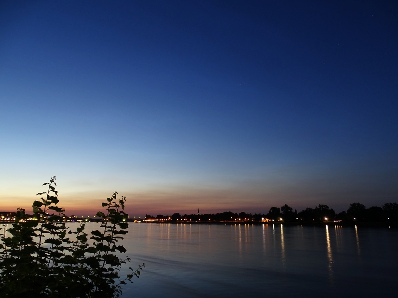 nachdem sich schon früh an einigen südlichen Cams ausgedehnte NLC-Displays gezeigt hatten, waren die Erwartungen auch hier in Bonn hoch. Tatsächlich tauchten pünktlich zum Ende der bürgerlichen Dämmerung gegen 22:20 MESZ 2 schwache Streifen recht hoch (etwa 30°) im Norden auf. Wir sind dann sofort zu einem der Beobachtungspunkte am Rheinufer geeilt. Dort stellte sich allerdings eine ziemliche Enttäuschung ein: ein diskontinuierliches, diffuses und extrem lichtschwaches Display (Helligkeit 1), welches im Laufe der nautischen Dämmerung auch nicht an Helligkeit zunahm (Abb. 1-4). Zur Frustbekämpfung habe ich dann noch ein Schiff (Abb. 5) gewarpt und einen Iridium-Flare abgelichtet (Abb. 6). Von den NLCs gibt es auch einen Zeitraffer (https://www.youtube.com/watch?v=f88ztCIFvvE), der leider viele Farbabrisse zeigt - ich hab in Erwartung eines "großen" Displays zu hoch in den Himmel gehalten - und ausgedehnte, homogene blaue Flächen sind nicht gerade die Stärke der Digiknipse. Immerhin, in HD abgespielt sind die NLCs erkennbar.