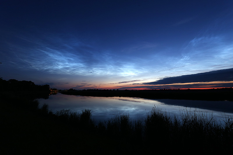 Danach begab ich mich an den Ryck und suchte eine Position auf, die mir einen halbwegs brauchbaren Blick in westliche Richtung versprach. Normalerweise sind die NLC ja auf die andere Seite vom Ryck beschränkt, also auf das nördliche Ufer. Heute aber war das anders, die NLC reichten bis weit in den Westen.