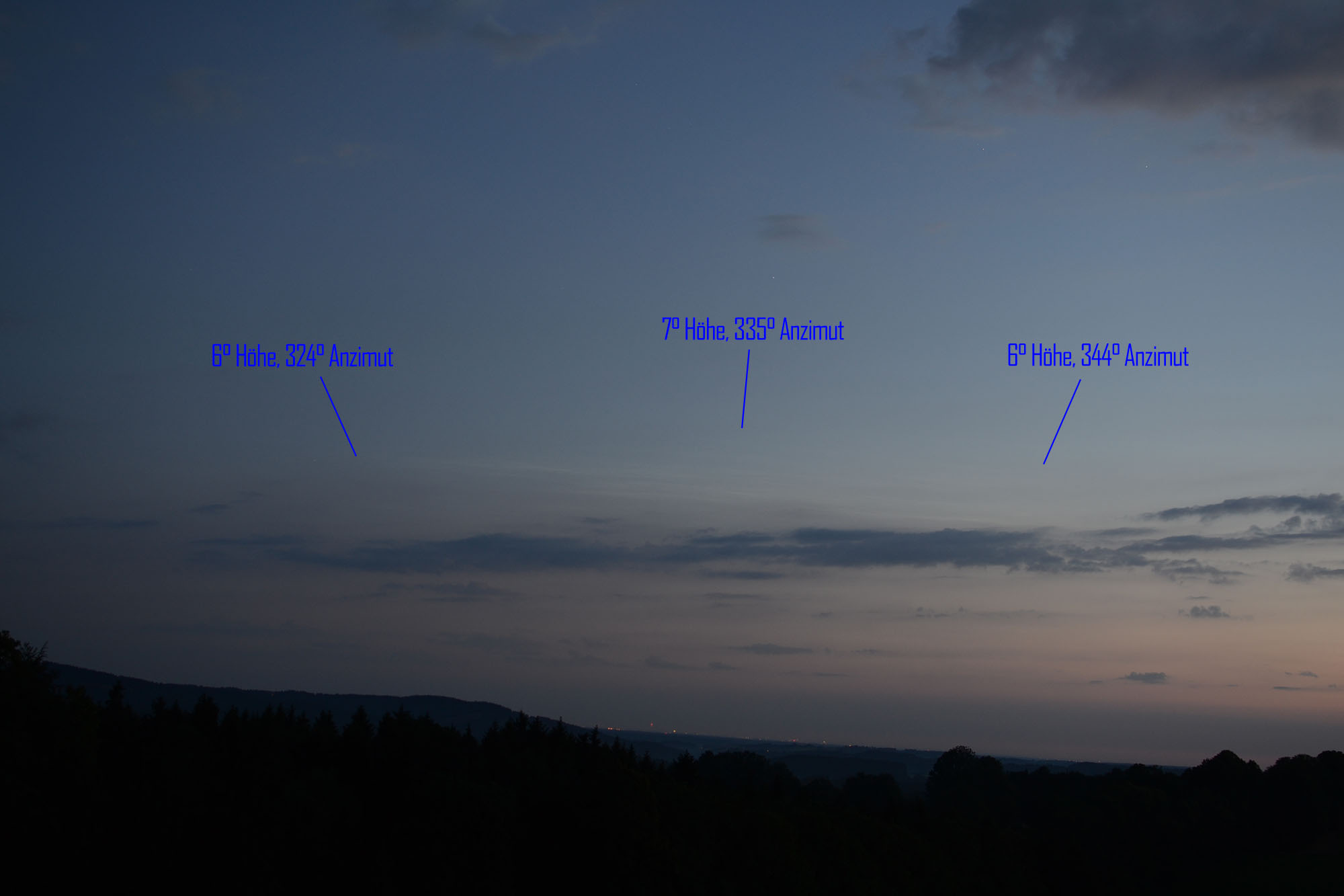 Am vergangenen Abend habe ich das horizontnahe Abendrot bewundert und auch ein paar Bildchen gemacht. Dabei sind mir Aufhellungen an dem noch recht hellen Himmel aufgefallen und habe mich gewundert, dass plötzlich ci zu sehen sind, die plötzlich auftauchten. Cirrus, ne, so nicht, sondern NCL. Anfangs konnte ich es kaum glauben, war etwas unsicher, es war noch recht früh am Abend, so um 22:15 MESZ. Also schnell ein paar Beweisbildchen gemacht und ab zum Beobachtungspunkt. Auch wenn anderswo solche lichtschwache Erscheinungen abwertend abgehakt werden, freut sich unsereiner in eher südlichen Breiten auf jeden NLC-Zipfel am Himmel. Hier nun die Daten zu der abendlichen Sichtung.