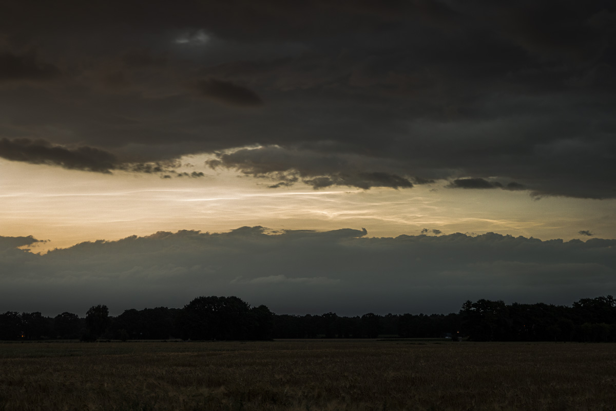 Mit fortschreitender Dämmerung zogen die NLCs sich rasch nach Norden zurück, wo sich im Dämmerungsbogen ein sehr strukturreiches Display etablierte. Versuche dieses mit Glühwürmchen, die vereinzelt an Gebüschrändern aufleuchteten, aufs Bild zu bannen, waren allerdings nicht erfolgreich. Zwischendurch richteten wir den Blick nach Südosten, wo der Mond mit einigen Wolken kämpfend unweit von Jupiter und Saturn stand. Gegen 23:30 beendeten wir die Session, um nun endlich zu unserer Wohnung zu fahren.