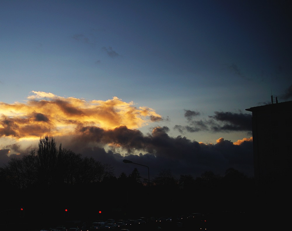 Ganz sicher war ich mir erst, als ich die zahlreichen Kondensstreifen darunter sah, die waren allesamt dunkel und nicht mehr direkt von der Sonne beleuchtet, 20 Minuten nach Sonnenuntergang auch kein Wunder. Erstaunlicherweise gab es eher nur so gelb-orange Töne, rot oder violette Färbungen traten diesmal nicht auf. Vielleicht hat das ja etwas mit der Partikelgröße zutun, oder mit weiter entfernter troposphärischer Bewölkung.