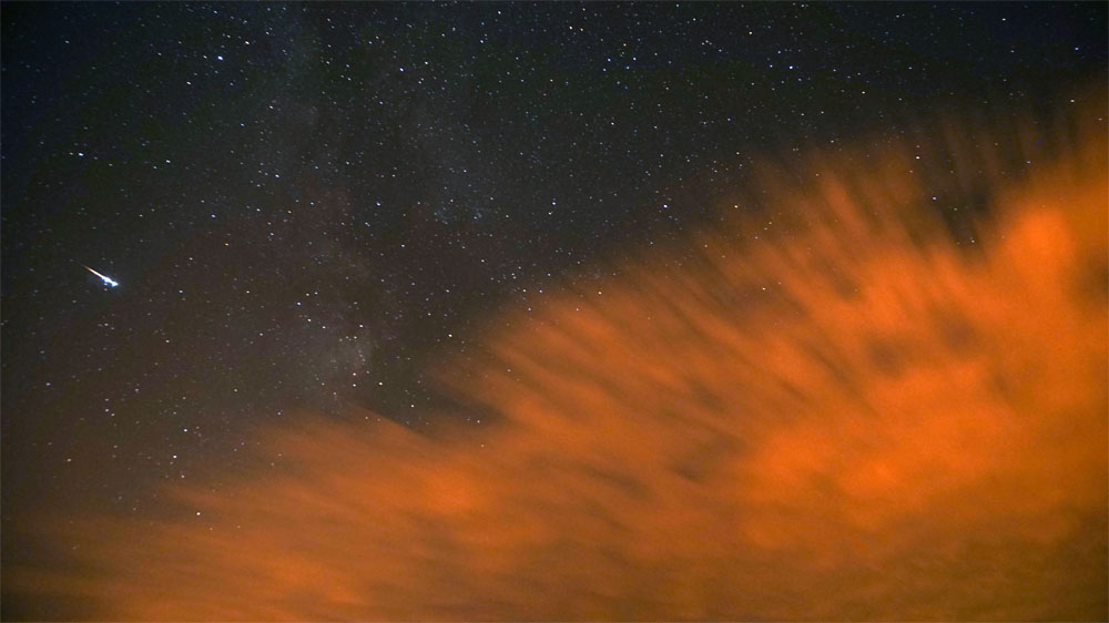 den hab ich auch gesehen (aber nicht fotografiert, da meine Kamera in eine andere Richtung zeigte). Farbe rötlich/gelb. Ich meine sogar, ein "Zerbrechen" gesehen zu haben. Für mich erschien der Meteor knapp unter dem Pegasus-Quadrart in östlicher Richtung.