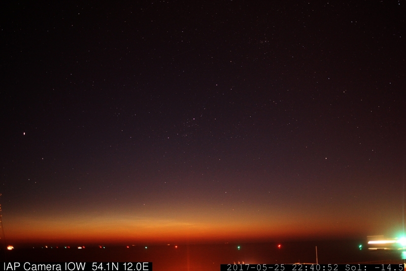 die IAP-Bilder dürfen prinzipiell nicht verwendet werden, jedoch wird es toleriert, wenn hier im Forum ganz gelegentlich Belegaufnahmen präsentiert werden. Dieser Fall ist sicherlich so eine Ausnahme, dass es keine anderen Beobachtungen zu geben scheint. Hier also ein Frame der IOW-Cam von 22:40 UT (=00:40 MESZ). Ich habe Gamma darstisch reduziert, damit die NLCs klarer hervortreten. Dies ist der Frame, auf dem sie noch am besten sichtbar sind und die größte Höhe erreichen, sofern man bei diesem Küssen des Horizonts von Höhe sprechen kann.