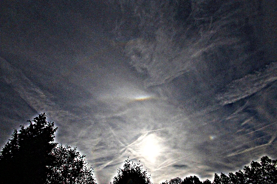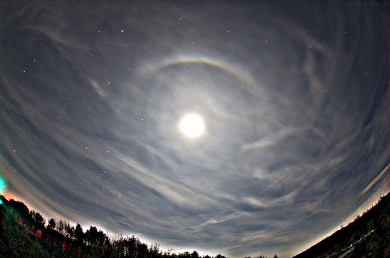 In der USM-Bearbeitung erkennt man noch einen 9°-Ring, der mir visuell aber nicht aufgefallen war. Etwa 10 Minuten später wurde der obere Teil des 22°-Rings sehr hell (in Verbindung mit dem umschriebenen Halo), und zwar soweit, dass Farben fürs Auge sichtbar wurden (rot und blau). Das ist auch bei gut ausgeprägten Mondhalos eher selten der Fall (zumindest bei mir).
