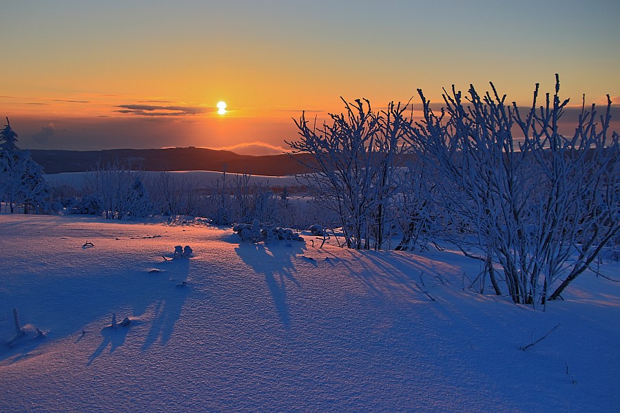 In Richtung Sachsenbaude gab es einige letzte Nebelschwaden. Ich mußte aber noch etwas warten, denn um in die Suppe hineinfahren zu können, braucht es eine Sonnenhöhe von mind. 5°C, damit die Sonne über dem Keilberg hinauslugt. Die Hände und das Gesicht habe ich irgendwann nicht mehr gespürt, aber aufgeben wollte ich auch nicht. Auf dem Weg nach unten (leider nicht weit genug, um dem Auto einen Hauch von Wärme zu entlocken) strahlte mir dann bereits unterhalb des Parkplatzes eine Unternebensonne entgegen. Ich hielt am Straßenrand, nahm das Hupen der anderen gelassen hin und machte ein paar erste Aufnahmen.