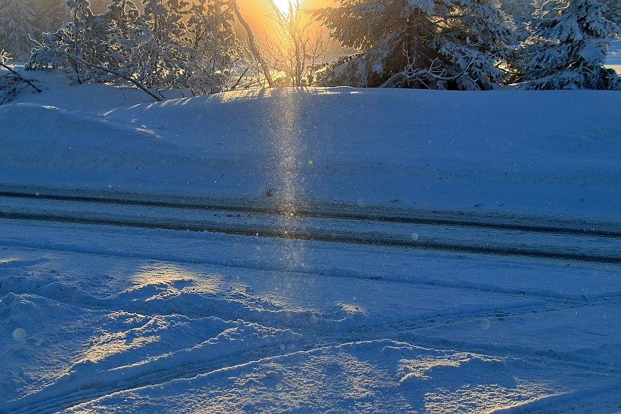 Nach einigen Minuten (was waren nochmal Hände???) wurde der Eisnebel schnell weniger und es glitzerte nur noch rings herum auf. Wie damals auf dem Sudelfeld waren jetzt kaum noch Halos eindeutig identifizierbar, das Gehirn formte keine Bögen mehr, es gab nur noch ein Glitzeruniversum, dessen Mittelpunkt ich war. Auch über mir und der Sonne gegenüber glitzerte es um die Wette und ich machte in alle Richtungen Fotos, aber die Kristalldichte war nicht mehr hoch genug, um auf den Fotos was zu sehen. Auf jeden Fall schwebte zum zweiten Mal über meinem Kopf ein Heiligenschein (ähhhmmmm ... Sonnenbogen). Das sind diese Art von Halos, die einfach nur irre sind, sich aber nicht mehr fotografieren lassen. Hier die letzten halbwegs gelungenen Schüsse.