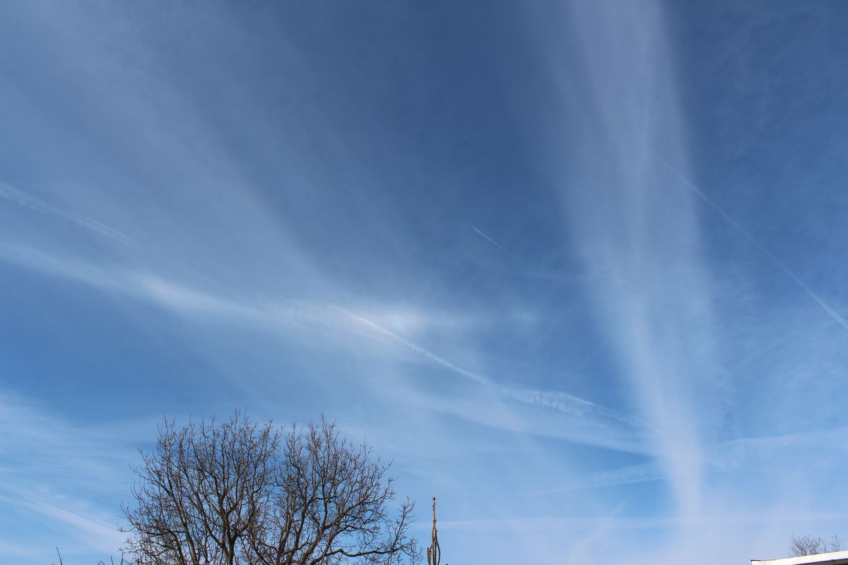 Nachdem sich der Halo weitestgehend aufgelöst hatte bildeten die Kondensstreifen einen zum Teil stark versetzten Schatten.