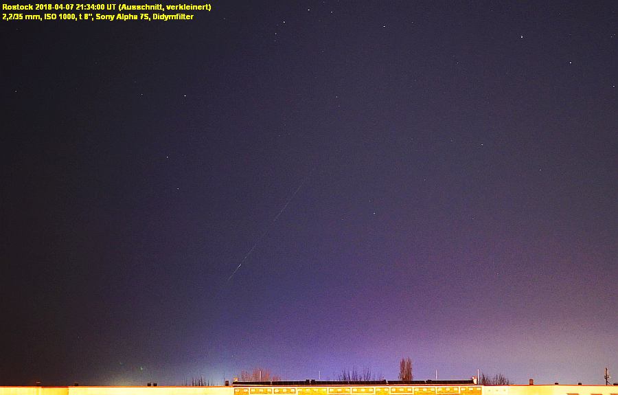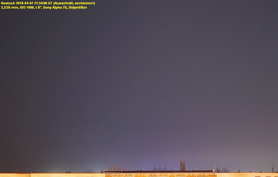 ich habe bei der Sichtung meiner Bilder festgestellt, dass ich den Meteor ebenfalls erwischt habe. Zeit haut hin. Mein Standort ist Eberswalde mit Blickrichtung Süd. Er ist also zwischen uns runtergekommen. Am Ende sieht er aus, als sei er geplatzt. Habe ihn leider nicht live gesehen.