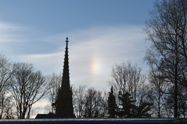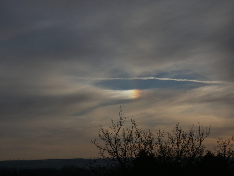 Heute früh gegen 9.30 Uhr: Beide Nebensonnen mit schwachem 22°-Ring heute mittag: Nebensonne mit Schweif, ca 14. Uhr: Und Nebensonne ganz bunt etwa eine halbe Stunde später: Grüße