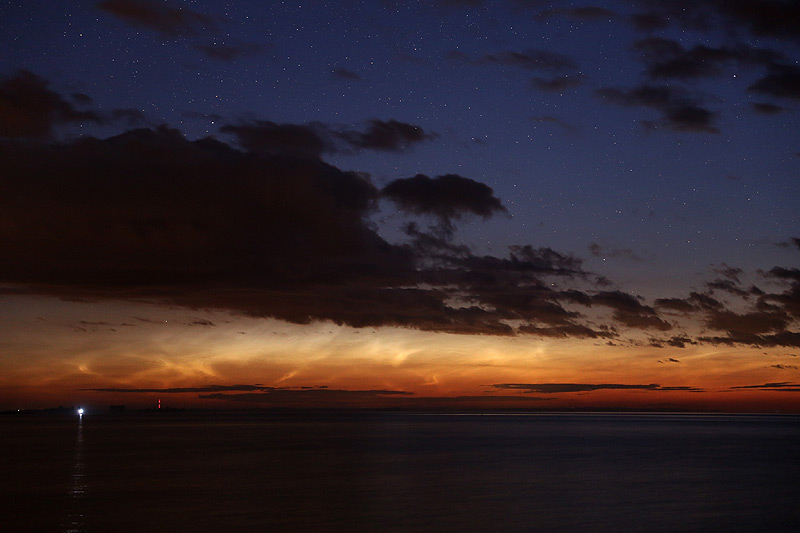 Ich war heute Nacht zwischen 1:20 und 3:30 trotz akuten "Magen Darm Problemen" in Greifswald Wiek unterwegs, um auf Wolkenlücken zu hoffen und Fotos von den NLC zu machen, die ich nach Hinweisen im Forum zuvor auf Webcams sehen konnte. Eigentlich war ich auch gerade erst heim gekehrt, von einer in Sachen NLC fruchtlosen ersten Runde an den Ryck, zu dem ich auch zuerst zurück kehrte und außer normaler Wolken nicht viel sehen konnte. Aber den Satellitenbildern vom Kachelmann zufolge sollten sich die Wolken wieder auflösen und daher fuhr ich dem klaren Himmel entgegen in Richtung Wieck.