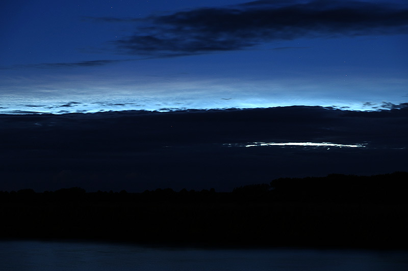 Dennoch gelang es mir nach einem Alarmstart, noch einige Fotos dieser vermutlich gigantischen NLC zu machen, wenn auch größtenteils hinter Wolkenlücken versteckt. Es war visuell eine deutliche blaue Aufhellung der Landschaft wahrnehmbar und das Leuchten am Himmel war auch sehr auffällig, ich würde fast dazu neigen, dem Display eine Helligkeit von 5 zu geben. Dafür spricht auch die Tatsache, das es einen roten oberen Rand hatte, was man nur selten und nur bei wirklich großartigen Displays beobachten kann.