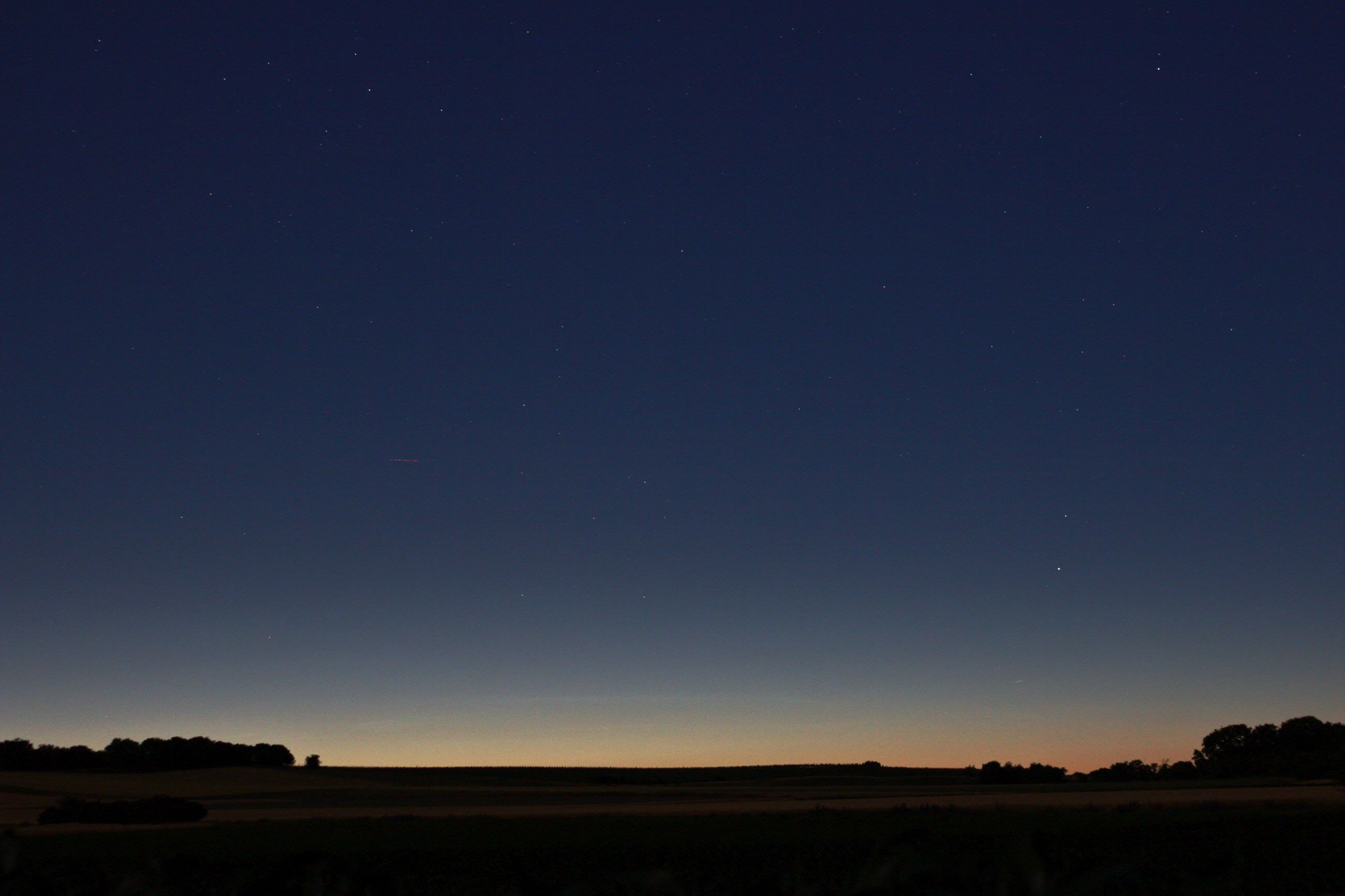 schließe mich Claudias Worten an… das große NLC-Feld (H3) war beeindruckend, da hätte man mal an der Ostsee stehen müssen… Die einzeln stehende NLC zog von Norden herauf und erweckte durch ihr helles Aussehen den Eindruck von Eigenleuchten. Der helle Mond erhellte die Landschaft auf besondere Weise… die schwächeren NLCs befanden sich weiter westlich (H2). Beobachtet vom Landberg bei Herzogswalde. Egal, was jetzt der MOrgen bringt, gegen 7 muss ich wieder los. Wenn ich Glück habe, in 2 Wochen für mal 3 Wochen Urlaub…