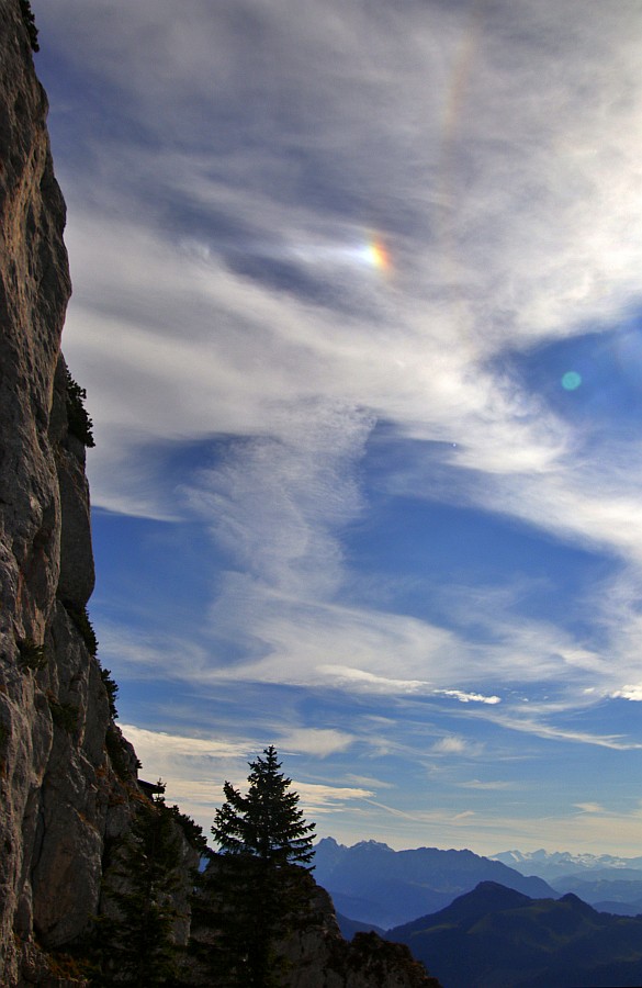 Es begann um 10.25 MEZ mit einem Horizontalkreisfragment im rechten 120°-Bereich. Dann zogen die Cirren schnell in Richtung Sonne und z.T. helle und farbenprächtige Nebensonnen, 22°-Ring und oberer Berührungsbogen gaben sich die Klinke in die Hand. Auf dem Gipfelweg zeigte sich an jeder Kurve ein anderes Bild und ich habe wohl noch nie so lange bis nach oben gebraucht