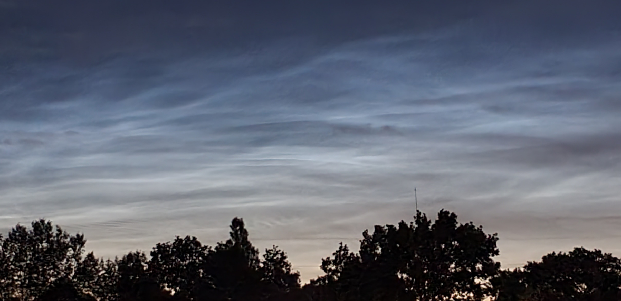 Schon bald nach Sonnenuntergang erschienen einige Wolken mit NLC-Anmutung am West- bis Nordhimmel. Doch Aufnahmen zeigten, dass sie die Bewegung der troposphärischen Wolken mitmachten und brav von West nach Ost zogen.