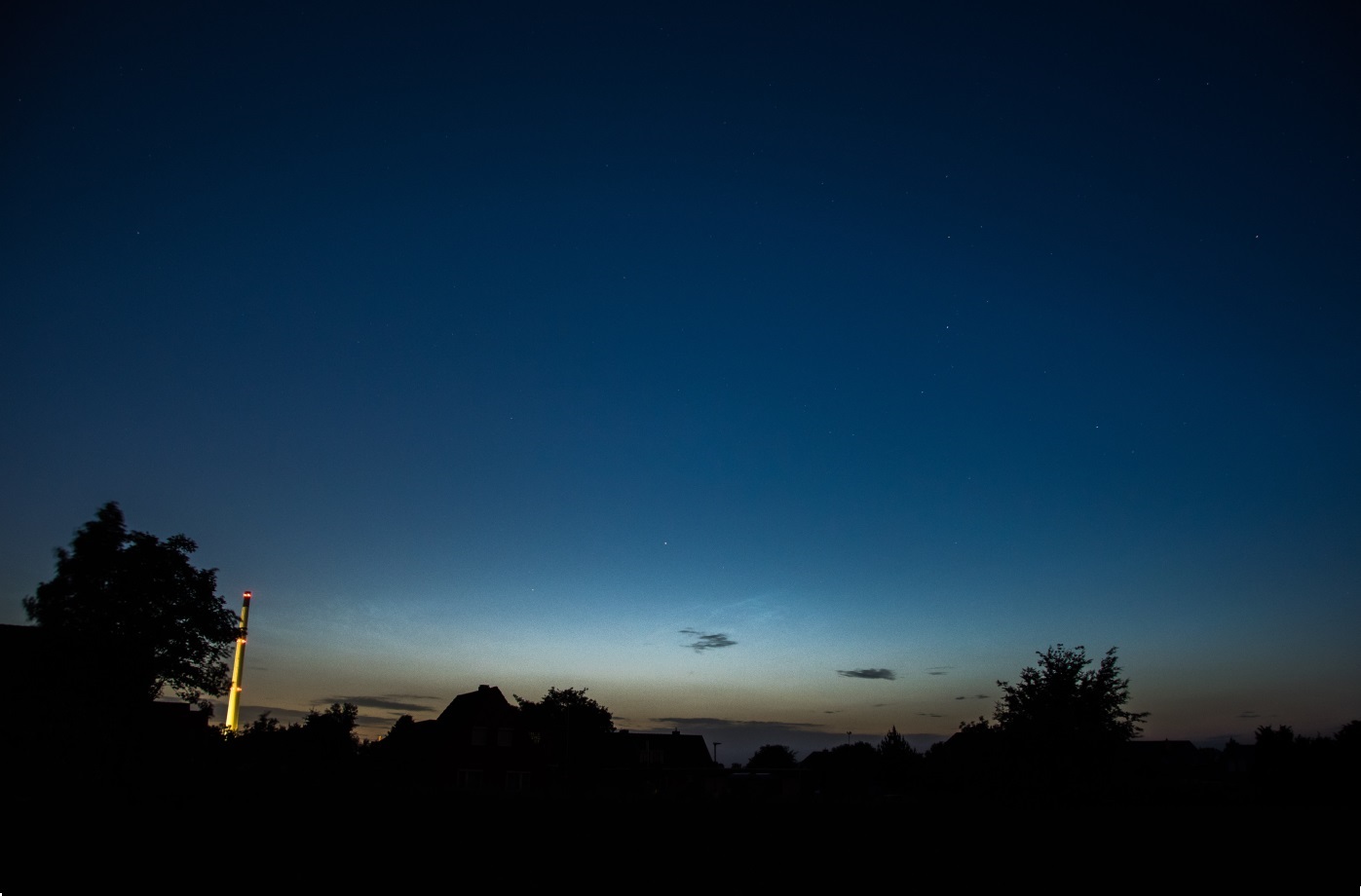 Allerdings musste ich reichlich lang warten, bis sich etwas tat. Erst kurz nach Mitternacht konnte ich eine leichte Aufhellung Richtung Norden wahrnehmen, die nicht mehr von den Cirren zu stammen schien. Also habe ich doch noch die Kamera herausgeholt und eine Testaufnahme gemacht. Ja, da war irgendwas. Gleichzeitig kam dann auch von Stefan die Frage über den Chat, ob da was sein könnte. Nach einigen Minuten war es dann klar, NLC. Ganz schwach und tief am Himmel, aber NLC!
