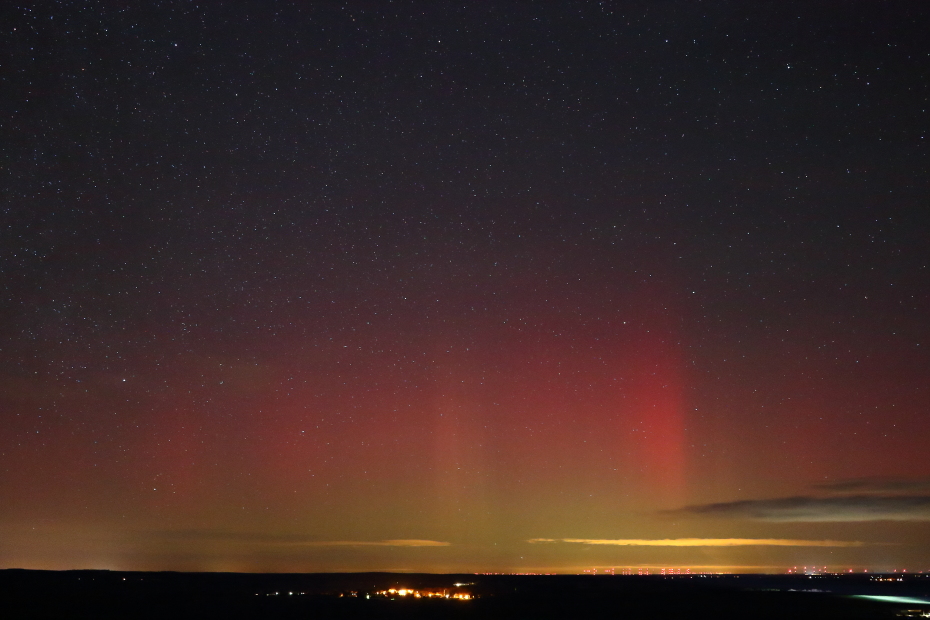 Kommentar: rotes Polarlicht als diffuse Fläche um 23:15 UTC schwach visuell; später Strahlen nur fotografisch; Sicht durch starke Bewölkung beeinträchtigt