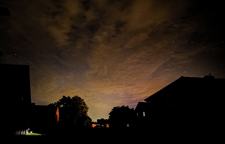 Derzeit fotografisches Polarlicht bei Lübbecke. Ganz aktuell zunehmende Aktivität, ein lila Glühen (bis auf Höhe 20 Grad+) mit wandernden Beamern bis in schätzungsweise 20 Grad Höhe.