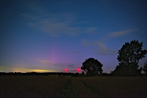 in Sittensen konnte ich in der letzten Nacht ein fotografisches Polarlicht aufnehmen. Es stellte sich als lila/rotes Glimmen mit einzelnen leichten Strahlen dar. Im Beobachtungszeitraum von 01:13 bis 02:20 Uhr war permanent leichte Aktivität auf den Fotos zu sehen.