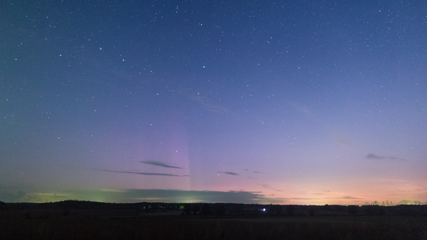 In der Nacht 25.07./26.07.2023 konnte ich ebenfalls Polarlicht in Form einer violetten (fotografischen) flächigen Verfärbung am Nordhorizont beobachten, auf die Schnelle habe ich es mit in den NLC-Faden zu dieser Nacht aufgenommen.