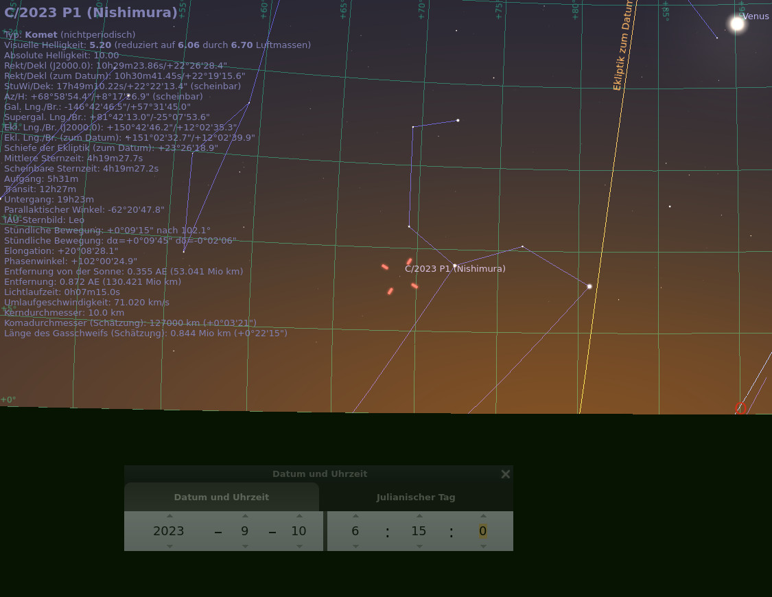 via Skyweek (runterscrollen bis unter die Perseiden) wurde ich gerade auf den neu entdeckten Kometen C/2023 P1 (Nishimura) aufmerksam, der Mitte September vielleicht ein interessantes Beobachtungsobjekt werden könnte. Letzteres kursiv, denn der Schweifstern ist nach derzeitiger Kenntnis ein Kandidat für eine vorzeitige Auflösung (s. https://www.facebook.com/photo/?fbid=700742702067209).