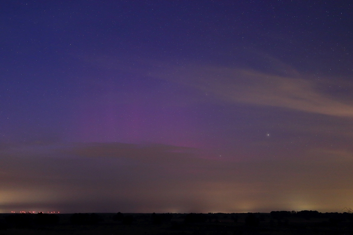 Ich konnte von meinem Standort bei Baitz (52.18N, 12.69E) in einer landschaftlich äußerst reizvollen Umgebung in den raren Wolkenlücken im Zeitraum ~20:45 - 21.25 MESZ ebenfalls fotografisches Polarlicht nachweisen, das dabei violett flächig und in Form von Strahlen(bündeln) auftrat. Aufgrund der unsicheren Wetterverhältnisse nutzte ich die Gelegenheit diesmal zur Erkundung eines neuen Standorts. Dabei machte ich bei der Standortwahl bewusst Abstriche hinsichtlich der Lichtverschmutzung gen Norden. Wichtiger war mir diesmal im Falle von einsetzendem Starkregen und/oder Gewittern eine Schutzhütte in unmittelbarer Nähe zu haben. Außerdem legte ich Wert auf einen fußläufig schnell erreichbaren Bahnanschluss, um nicht immer auf das Fahrrad angewiesen zu sein. Gewitter und Starkregen erreichten mich dann allerdings erst am frühen Morgen am Umsteigebahnhof. Interessant hingegen war die Erfahrung, ohne Handy, das ich zu Hause vergessen hatte, weder über die Werte am DSCOVR, noch über die aktuelle Polarlichtaktivität im Bilde zu sein.