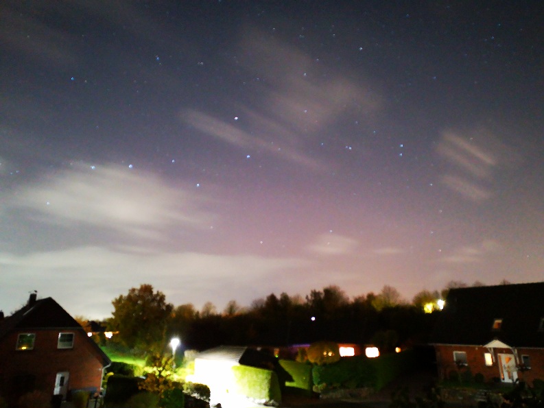 Dennoch habe ich einen Blick nach Norden geworfen. Visuell bestenfalls eine leichte Aufhellung. Für die Farbwahrnehmung zu schwach. Fotografisch (EOS 6Da) gut erkennbar. Beobachtung von Marquardt im Norden Potsdams. Aufnahmezeit 2221 MEZ.